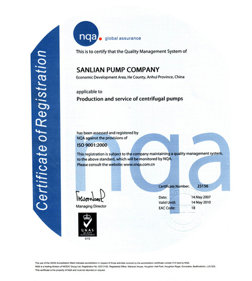 Sanlian Pumps represent a fusion of computer-aided design and manufacturing echniques, guaranteeing you the best performance. To maintain the high standard quality set by Sanlian, all pumps are subjected to stringent inspection at all stage of production. They also comply with the appropriate international quality assurance and inspection standards. As a symbol of this reliability, Sanlian has been accredited with ISO 9001 certification.